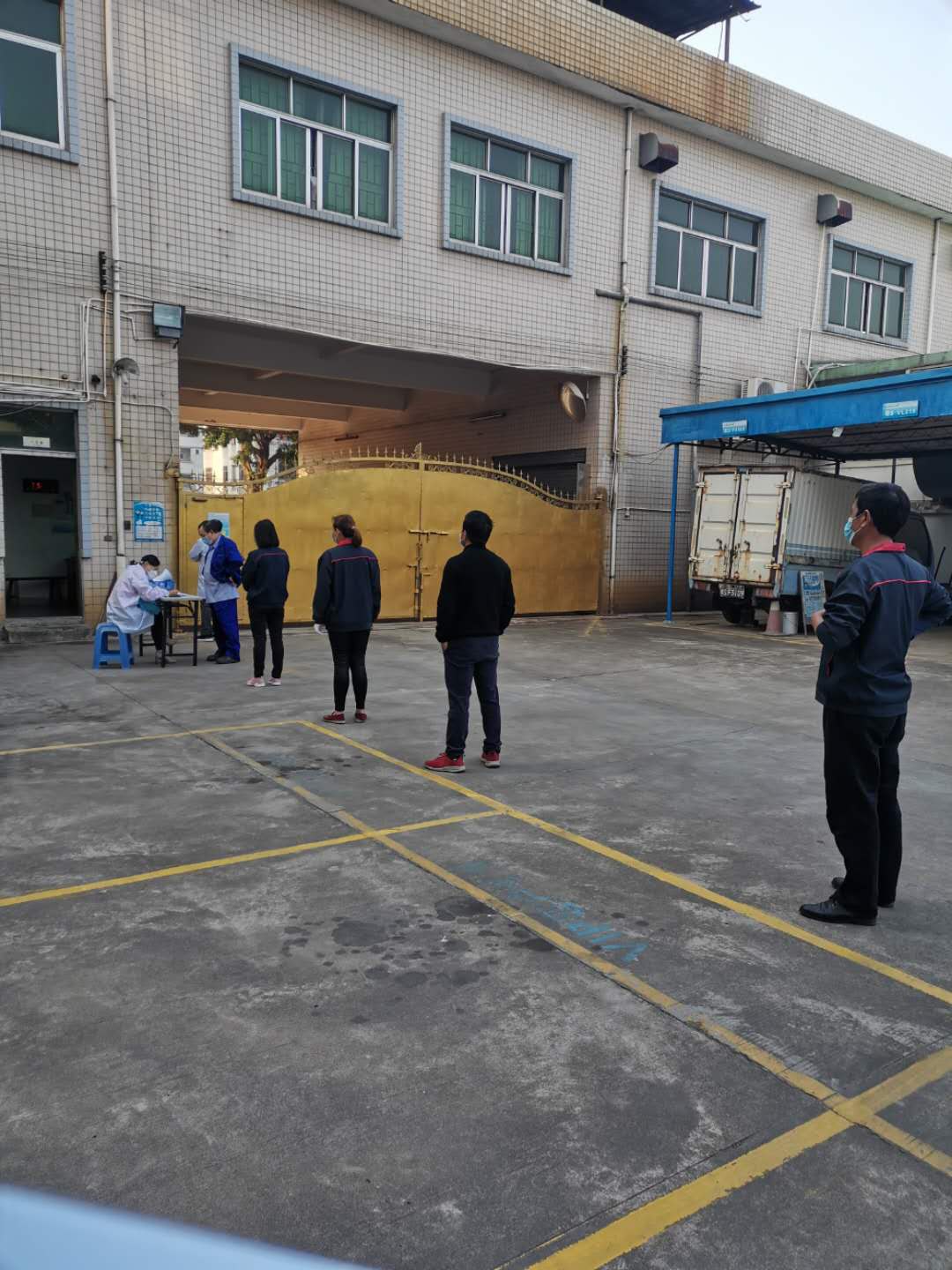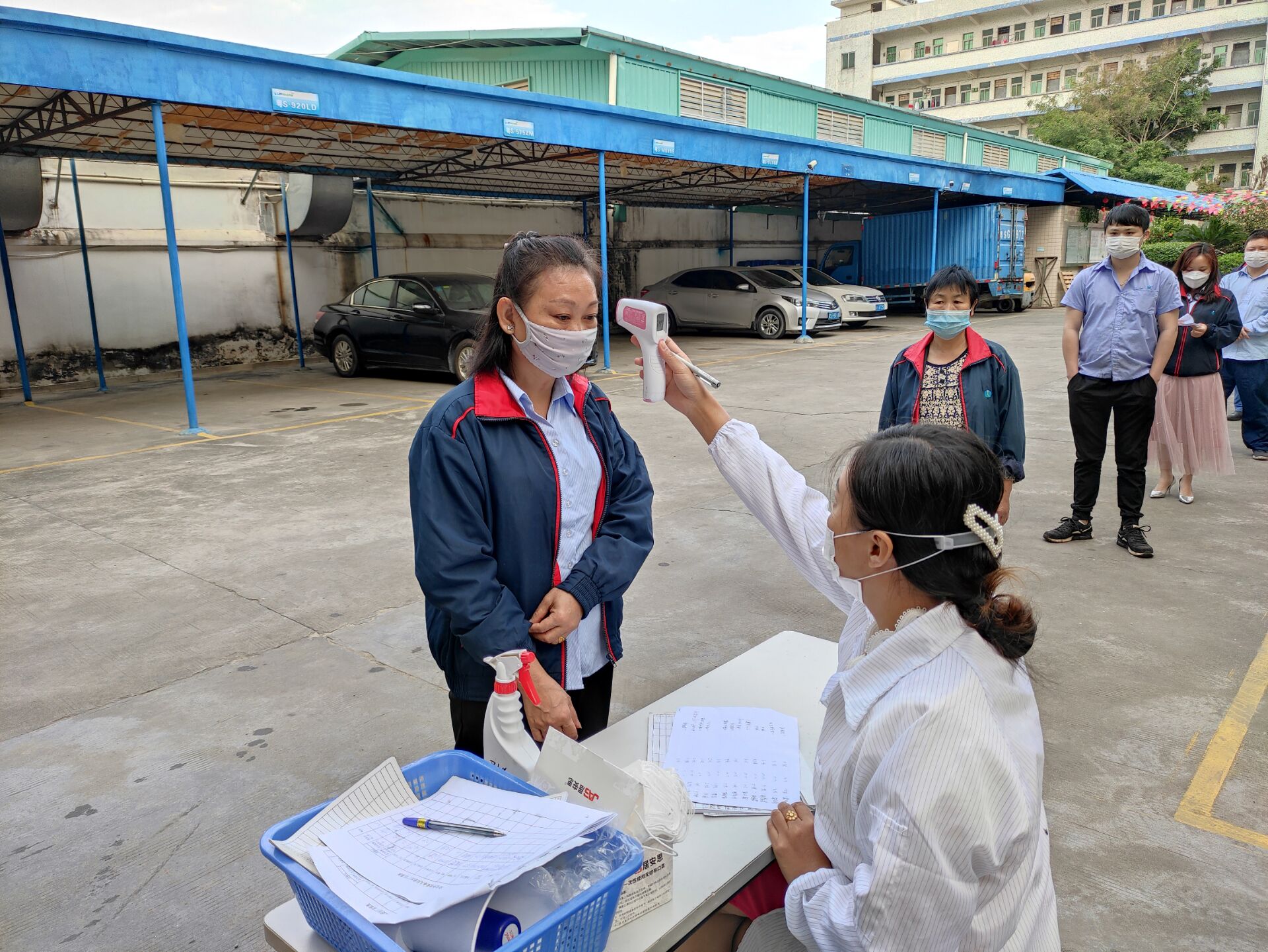 ▲保安人員將對(duì)進(jìn)廠人員登記和測(cè)量體溫